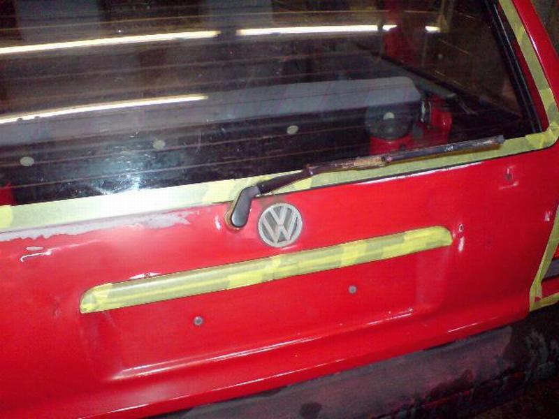 Dann die Heckklappe. Die simple Reparatur der Rostlöcher mit Karosseriedichtmasse sieht gut aus. | ||